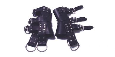 Heavy duty leather ankle restraints capable of suspension over a boot via double-D rings. Please note that suspension should be practiced with the utmost care, safety and caution.
