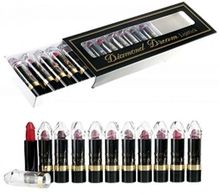 Each box contains 12 lipsticks with an array of color from Hooker Reds, Creamy Pinks, Sparkly Mauves, and Opal Rouge... each lipstick case is a clear phallic-shaped top with a twist bottom and gold foil script. The lipstick themselves are rich in color and pecker shaped complete with a veiny shaft and perfect mushroom head.